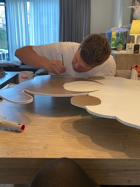 Oneffenheden worden bijgewerkt en geschuurd. Dan wordt het geboortebord 2 maal gegrond voor optimale bescherming en zo stapsgewijs uitgetekend. Het inkleuren gebeurd ook 2 maal om de kleuren zo goed mogelijk tot zijn recht te laten komen.